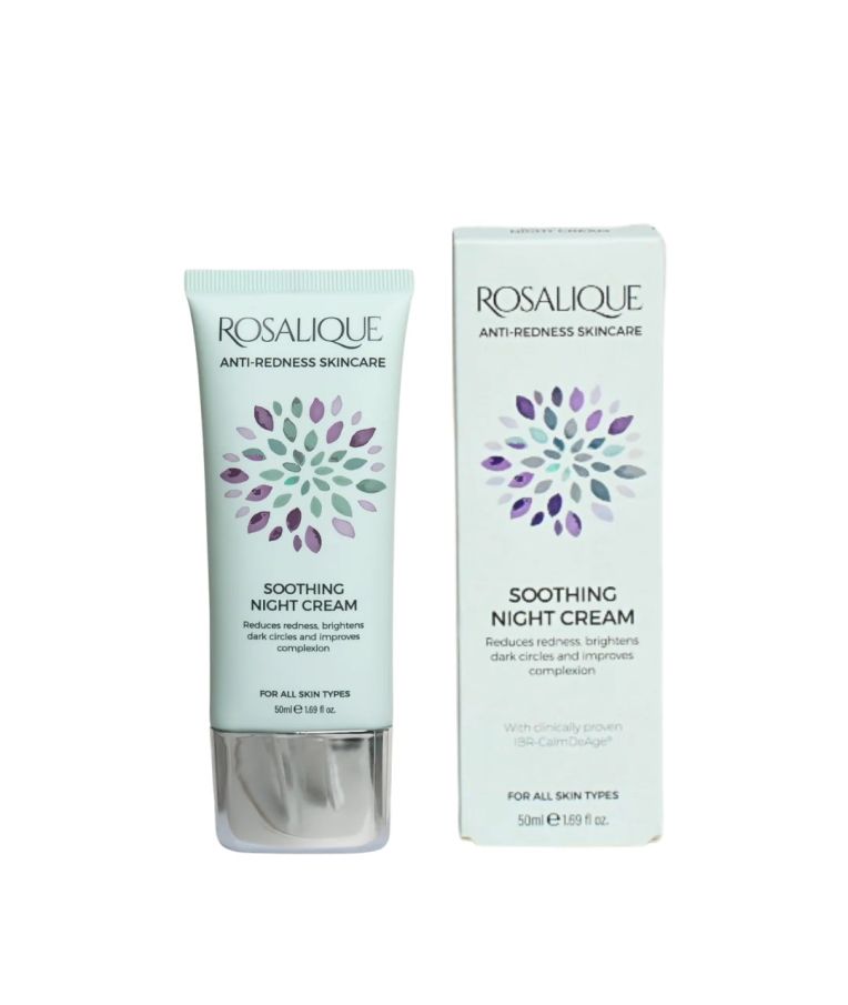 Rosalique raminantis naktinis kremas raustančiai odai sukurtas papildyti  Rosalique 3in1 Anti-Redness Miracle Formula SPF50 kremą raustančiai veido odai, suteikiantis vakarinei odos priežiūros rutinai odą drėkinamųjų, raminančių ir raudonį mažinančių savybių.