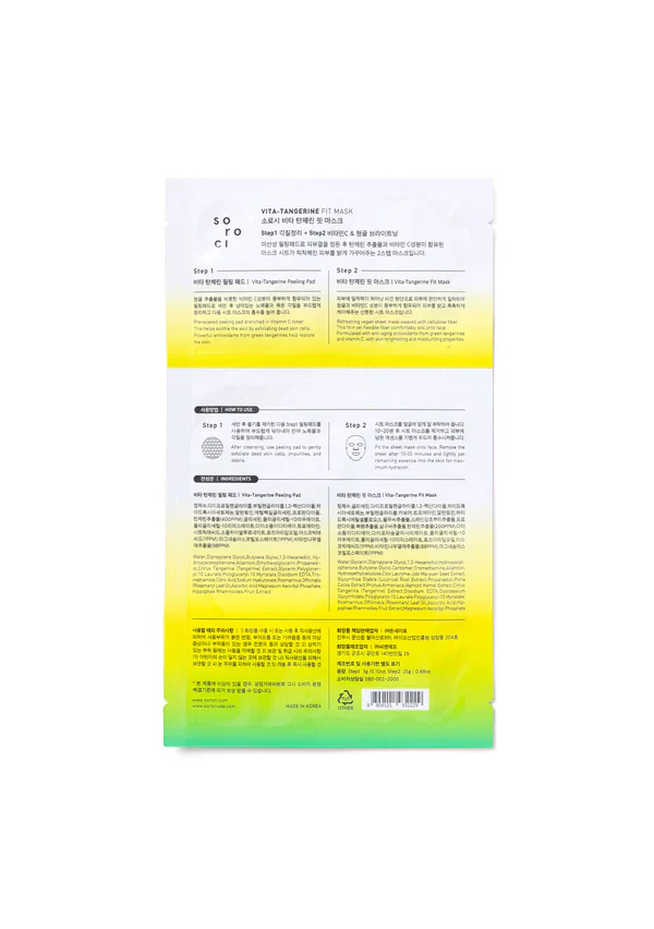 Drėgnas veido šveitimo lapelis, suvilgytas toniku su vitaminu C. Efektyviai pašalina negyvas veido odos ląsteles, glotnina ir gaivina odą. Galingi žaliųjų tangerinų antioksidantai skatina odos regeneraciją.